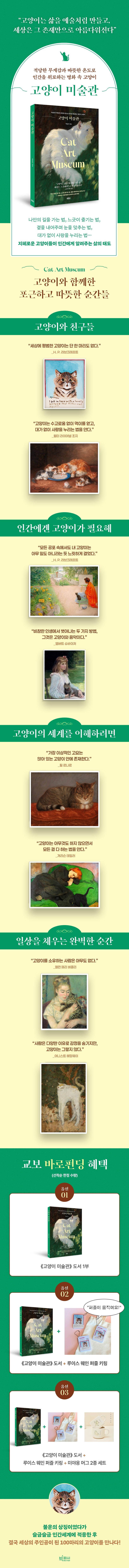 그가 고른 그림들은 고양이와 함께한 포근하고 따뜻한 순간들을 떠올리게 하며, 고단한 하루 끝에 다가와 아무 말 없이 곁을 지키며 위로해주는 그들을 더욱 사랑하게 만든다.