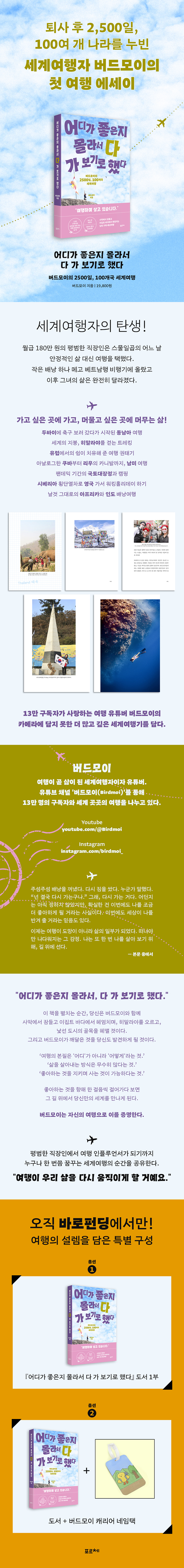 특히 팬데믹으로 세계가 멈췄을 때도 버드모이는 그 시간을 허투루 보내지 않았다. 국경이 닫히고, 비행기가 뜨지 않았으며 여행으로 먹고사는 사람에게는 생존의 위기였던 그 기간에도 한국의 구석구석을 다니며 영상을 만들고, 다음 여행을 준비했다. 떠날 수 없는 시간조차 '떠나기 위한 시간'으로 채웠다. 자신이 얼마나 여행을 좋아하는지, 길 위에서의 삶이 얼마나 절실한지를 느끼며 팬데믹 이후 더 깊고 진정성 있는 여행으로 이어나갔다. 이 책은 좋아하는 일을 지키기 위한 한 사람의 치열한 노력이기도 하다. 버드모이가 겪은 여행의 낭만과 고난을 가장 진솔하게 표현했다. 유튜브 채널로는 다 전할 수 없던 감정의 여백들이 사람과 풍경, 실패와 용기의 이야기로 문장 안에서 생생히 숨 쉰다.
