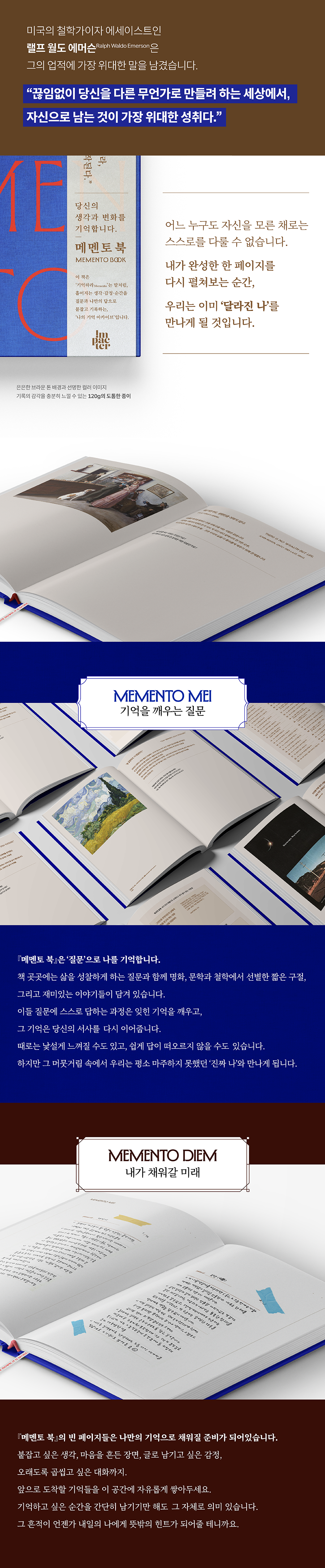 삶에 정답지나 해설지는 없습니다. 모두 저마다의 답을 내며 살아갈 뿐입니다. 『메멘토 북』도 마찬가지입니다. 서로 다른 풀이 과정을 통해 나만의 답을 찾아가야 합니다. 질문과 답, 그리고 이어지는 자유로운 빈 페이지는 나를 탐색하고 순간을 포착하는 새로운 형태의 기록입니다. 삶에서 회피해 온 문제를 마주하는 과정에서 우리는 내면의 힘을 기르게 되고, 그 힘을 통해 마침내 달라진 나를 만나게 됩니다.