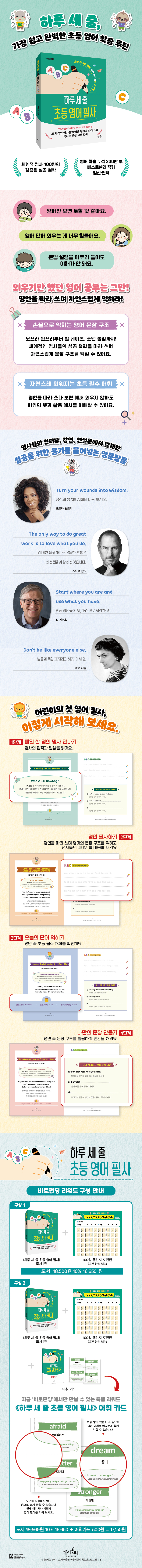 오프라 윈프리, 빌 게이츠, J.K. 롤링, 스티브 잡스, 마이클 조던 등 세계적인 명사들의 인터뷰, 연설, 강연에서 핵심 메시지를 선별해 어린이의 이해 수준에 맞는 간결한 영어 문장으로 재구성했다. 문장은 짧고 쉽지만, 그 안에 담긴 의미는 결코 가볍지 않다. 아이들은 이 문장들을 하루 세 줄씩 따라 쓰며 영어를 익히는 동시에 실패를 대하는 태도, 도전을 대하는 마음가짐, 꿈을 이루는 사람들의 사고방식을 마음에 새길 수 있다.