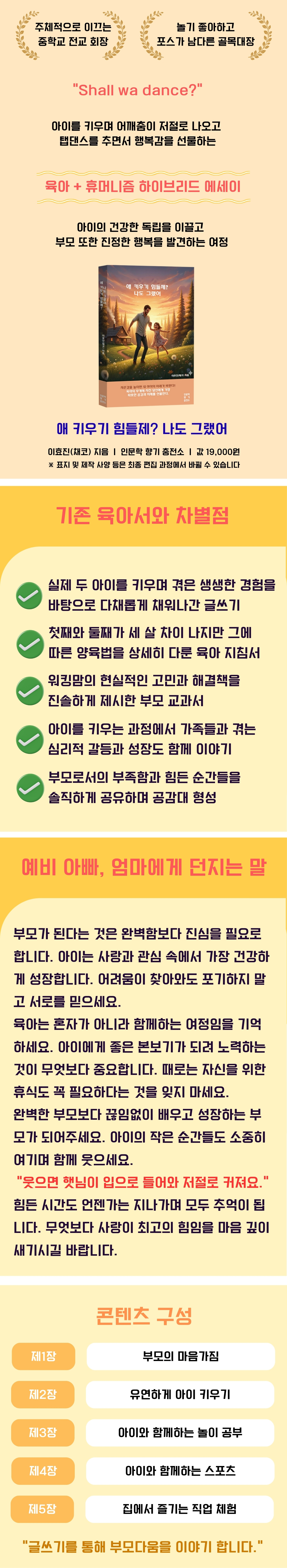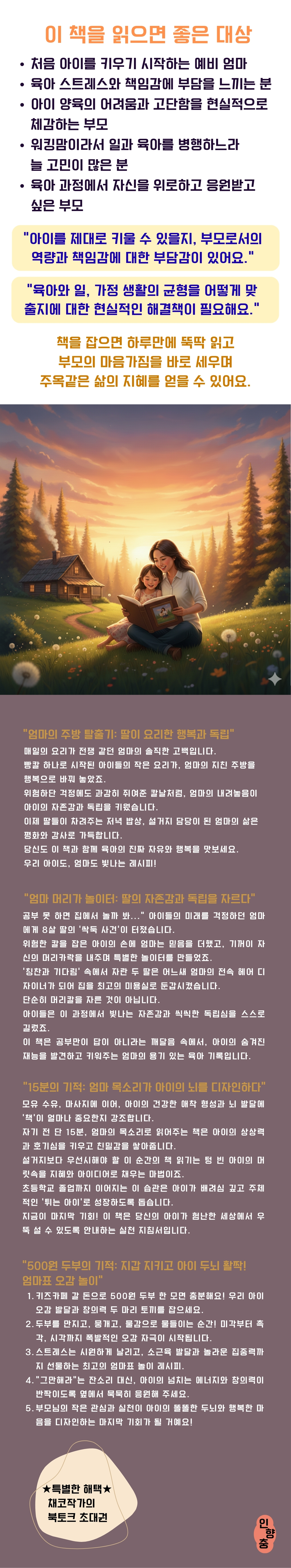 이 책은 단순한 육아서적을 넘어, 아이와 부모가 함께 만들어가는 ‘우리 이야기’를 진솔하게 풀어낸 동반자서로서 누구나 읽고 싶은 필독서가 될 것입니다. 육아라는 긴 여정에서 잠시 힘이 되어주고 싶은 모든 이들에게 강력하게 추천합니다.